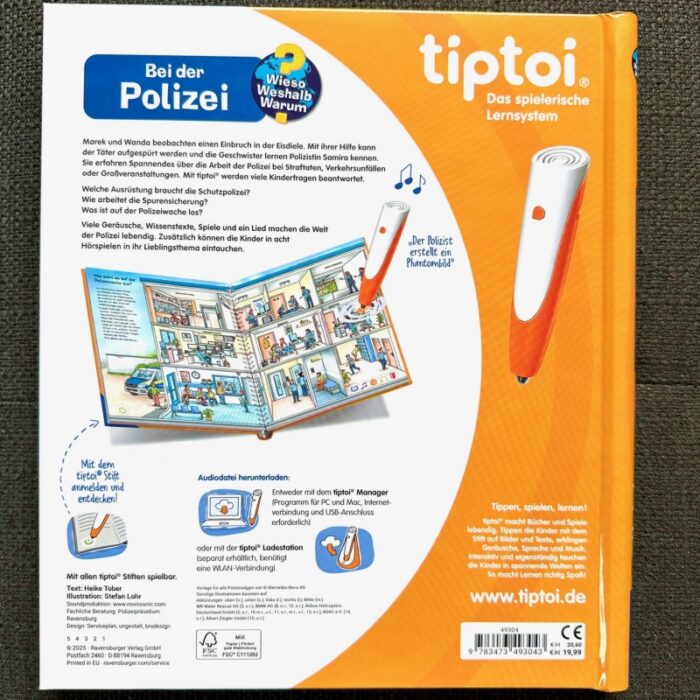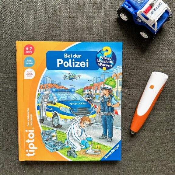 Wer schon immer mal wissen wollte, was man bei der Polizei genau macht, ist mit dem neuen tiptoi-Buch aus der Wieso, Weshalb, Warum?-Reihe „Bei der Polizei“ genau richtig. Die Altersangabe von 4-7 Jahre passt, wobei man das nach oben übers gesamte Grundschulalter ausdehnen kann.