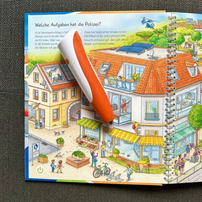 Es gibt wirklich viel zu entdecken: von der Geschwindigkeitskontrolle über das Lösen von Kriminalfällen bis hin zum Einsatz von Spezialeinheiten bekommen die Kids einen umfassenden Einblick in den Polizeialltag. Es gibt auf jeder Doppelseite einen kurzen Erklärungstext zum jeweiligen Themenschwerpunkt, eine Geschichte und Spiele. Außerdem kann man natürlich alles frei mit dem Stift erkunden und es gibt sogar ein Lied im Buch.
