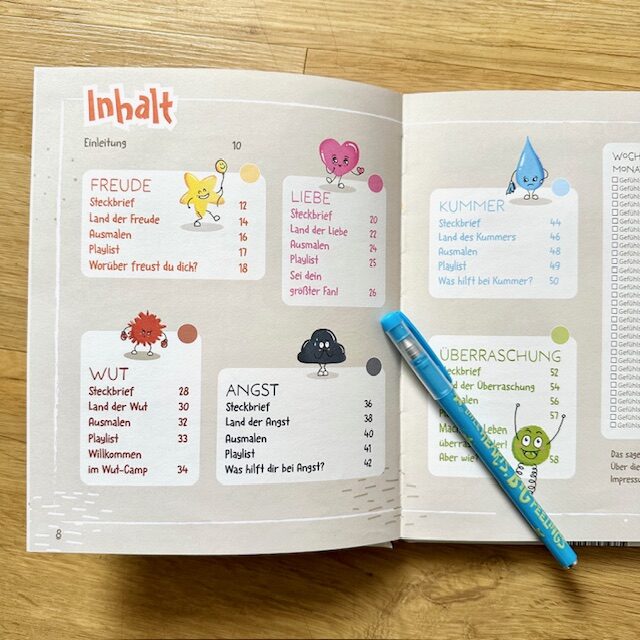 Im Tagebuchteil gibt es eine Doppelseite für jede Woche einen Monatsrückblick, bei dem man verschiedenste, wechselnde Fragen findet, wie: „Das hat mich diese Woche wütend gemacht“, oder „Das habe ich über mich gelernt“. Außerdem gibt es verschiedene andere Tools, um seinen Gefühlen auf die Spur zu kommen, wie dem Gefühlsbarometer, der Gefühlswolke oder Emotionskringel.